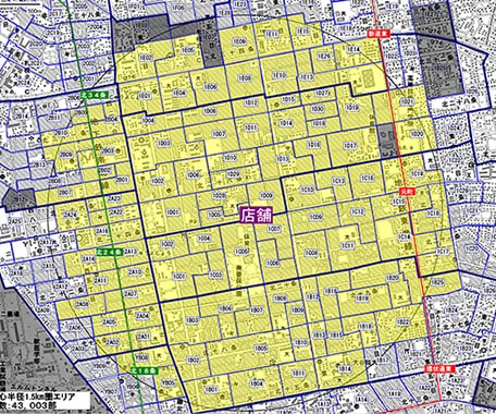 店舗の所在地である中⼼地から半径1.5km圏範囲にあるポスティング地図です。配布地域が⻩枠で表⽰されます。