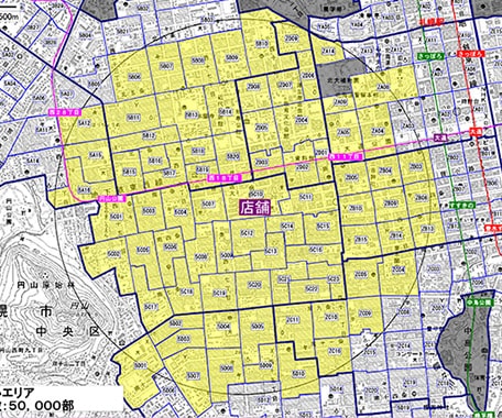 店舗の所在地である中⼼地から、近いエリアを優先に50,000枚設定したポスティング地図です。配布地域が⻩枠で表⽰されます。